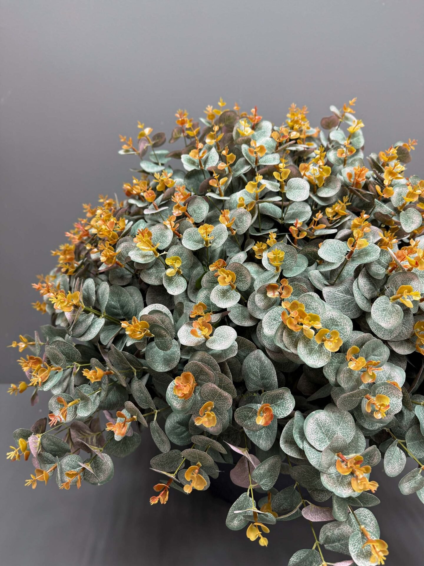 - Unique Color Combination: Features realistic green-grey eucalyptus leaves with vibrant orange-yellow accents, creating a charming rustic appeal.
